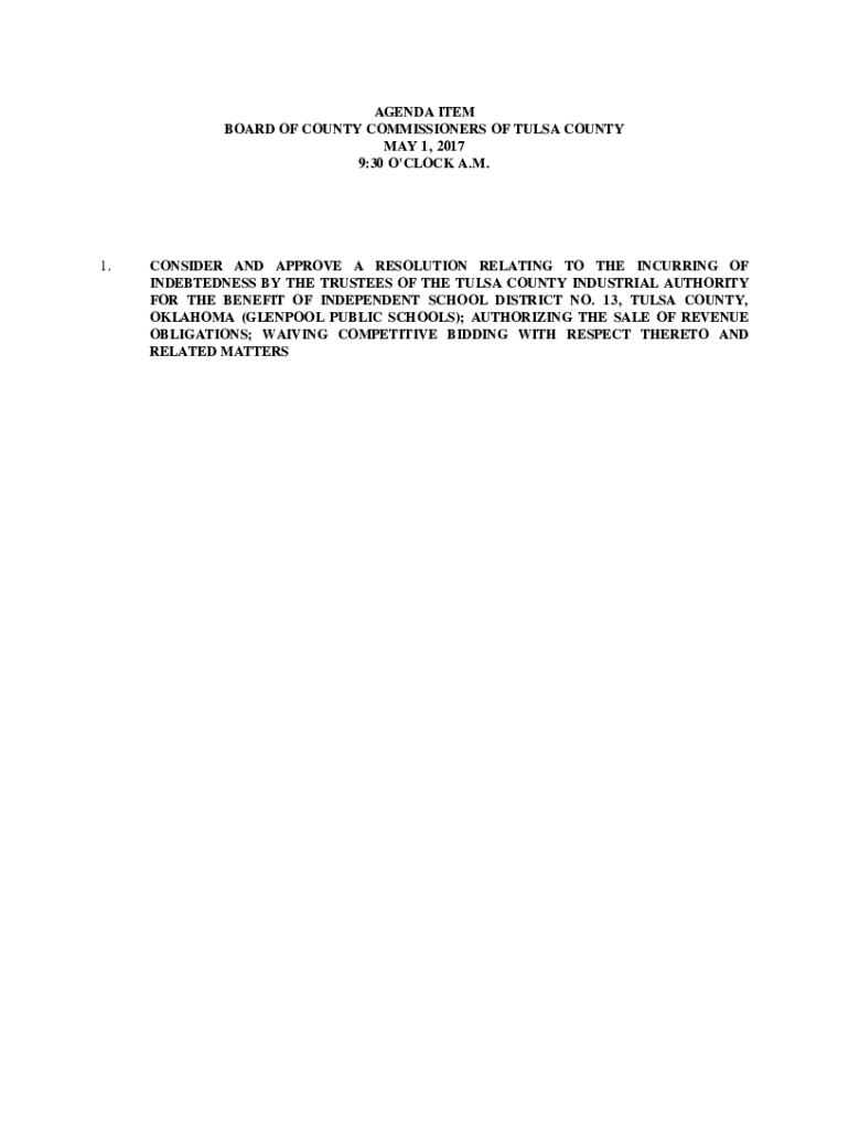 AGENDA ITEM BOARD OF COUNTY COMMISSIONERS OF TULSA COUNTY MAY 1, 2017 9:30 O\'CLOCK A.M.1.CONSIDER AND APPROVE A RESOLUTION RELATING TO THE INCURRING OF INDEBTEDNESS BY THE TRUSTEES OF THE TULSA COUNTY
