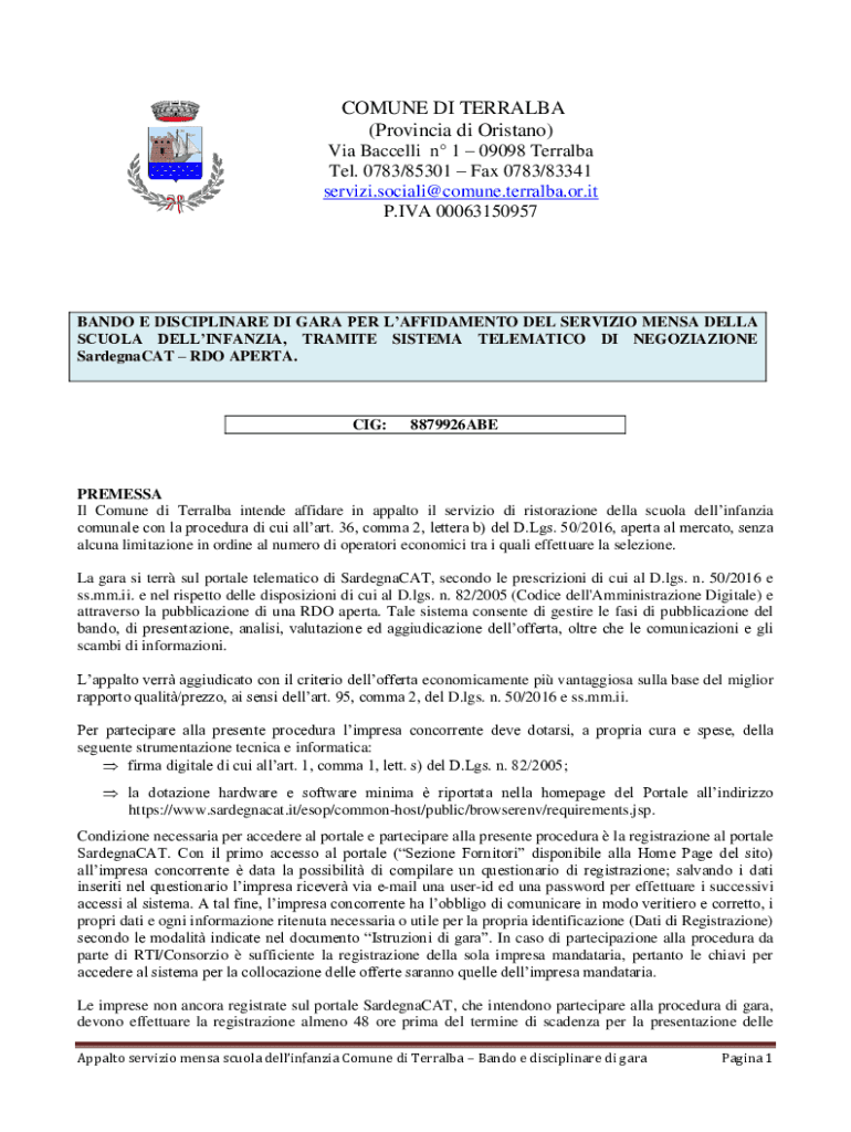 COMUNE DI TERRALBA (Provincia di Oristano) Via Baccelli n 1 09098 Terralba Tel. 0783/85301 Fax 0783/83341 servizi.sociali@comune.terralba.or.it P.IVA 00063150957BANDO E DISCIPLINARE DI GARA PER LAFFIDAMENTO