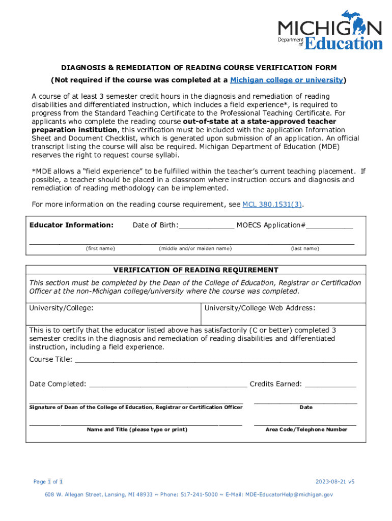 DIAGNOSIS & REMEDIATION OF READING COURSE VERIFICATION FORM (Not required if the course was completed at a Michigan college or university) A course of at least 3 semester credit hours in the diagnosis
