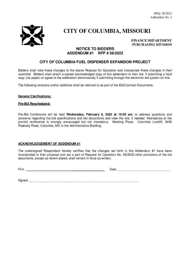 RFQ: 58/2022 Addendum No. 1CITY OF COLUMBIA, MISSOURI FINANCE DEPARTMENT PURCHASING DIVISIONNOTICE TO BIDDERS ADDENDUM #1 RFP # 58/2022 CITY OF COLUMBIA FUEL DISPENSER EXPANSION PROJECT Bidders shall
