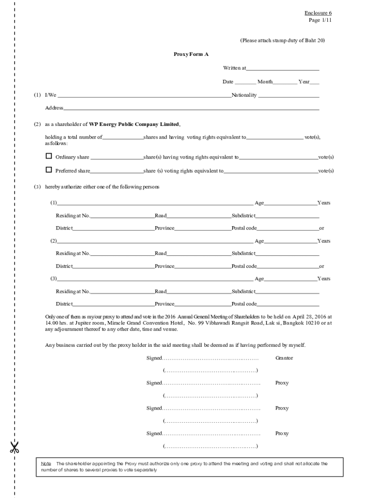 Enclosure 6 Page 1/11 (Please attach stamp duty of Baht 20) Proxy Form A Written at Date (1) I/WeMonthYearNationalityAddress (2) as a shareholder of WP Energy Public Company Limited, holding a total