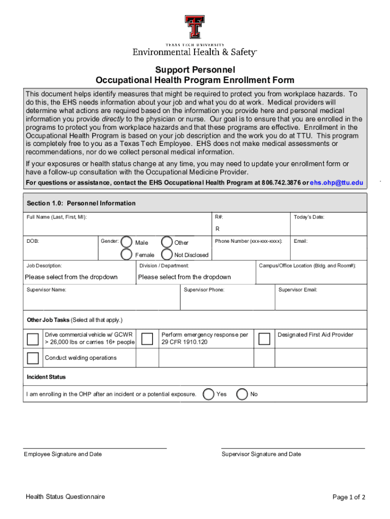 Support Personnel Occupational Health Program Enrollment Form This document helps identify measures that might be required to protect you from workplace hazards. To do this, the EHS needs information