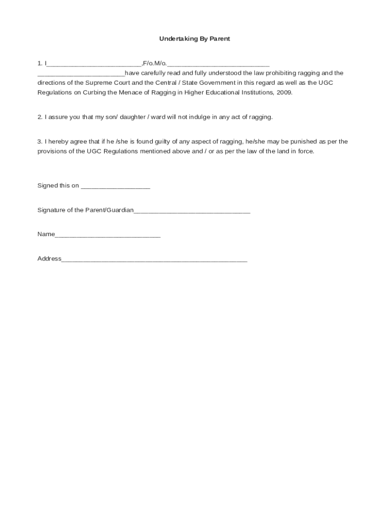 Undertaking By Parent1. I___,F/o.M/o.___ ___have carefully read and fully understood the law prohibiting ragging and the directions of the Supreme Court and the Central / State Government in this