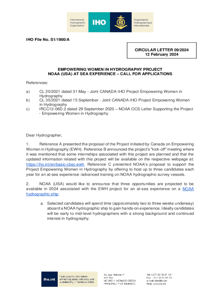 IHO File No. S1/1900/A CIRCULAR LETTER 09/2024 12 February 2024EMPOWERING WOMEN IN HYDROGRAPHY PROJECT NOAA (USA) AT SEA EXPERIENCE CALL FOR APPLICATIONS References: a) b) c)CL 20/2021 dated 31 May