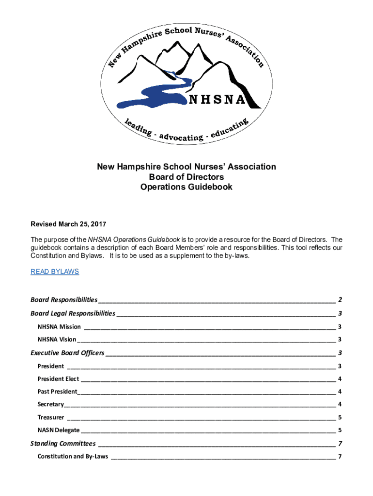 New Hampshire School Nurses Association Board of Directors Operations GuidebookRevised March 25, 2017 The purpose of the NHSNA Operations Guidebook is to provide a resource for the Board of Directors.