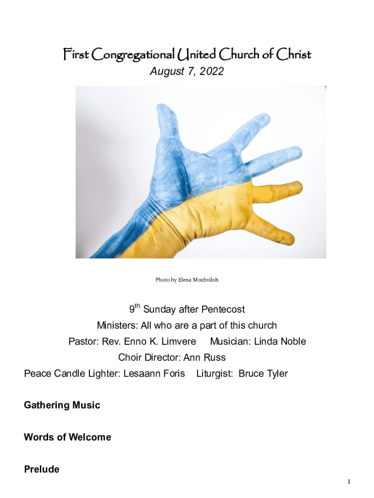 First Congregational United Church of Christ August 7, 2022Photo by Elena Mozhviloh9th Sunday after Pentecost Ministers: All who are a part of this church Pastor: Rev. Enno K. LimvereMusician: Linda