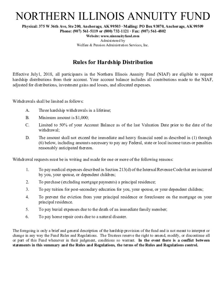 NORTHERN ILLINOIS ANNUITY FUND Physical: 375 W 36th Ave, Ste 200, Anchorage, AK 99503 Mailing: PO Box 93870, Anchorage, AK 99509 Phone: (907) 5615119 or (800) 7321121 Fax: (907) 5614802 Website: www.niannuityfund.com