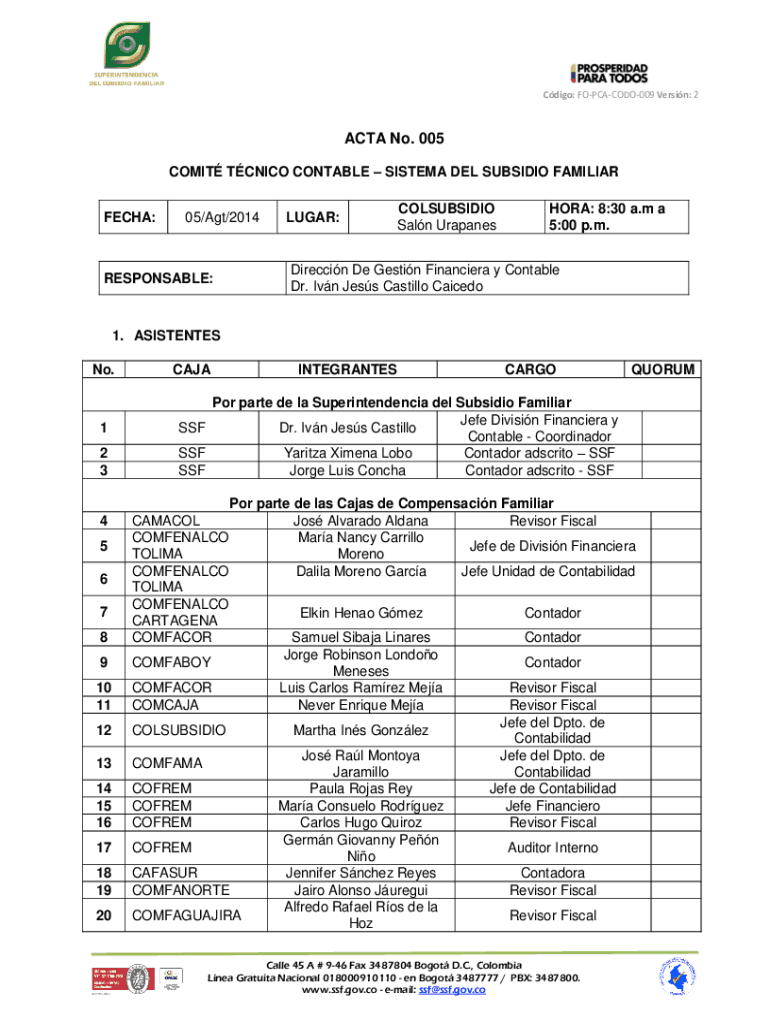 Cdigo: FOPCACODO009 Versin: 2ACTA No. 005 COMIT TCNICO CONTABLE SISTEMA DEL SUBSIDIO FAMILIAR FECHA:05/Agt/2014LUGAR:COLSUBSIDIO Saln UrapanesHORA: 8:30 a.m a 5:00 p.m.Direccin De Gestin Financiera