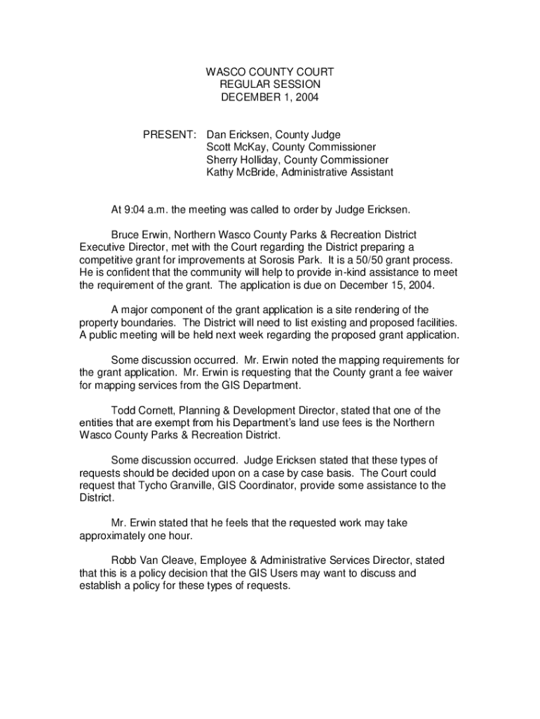 WASCO COUNTY COURT REGULAR SESSION DECEMBER 1, 2004PRESENT: Dan Ericksen, County Judge Scott McKay, County Commissioner Sherry Holliday, County Commissioner Kathy McBride, Administrative AssistantAt