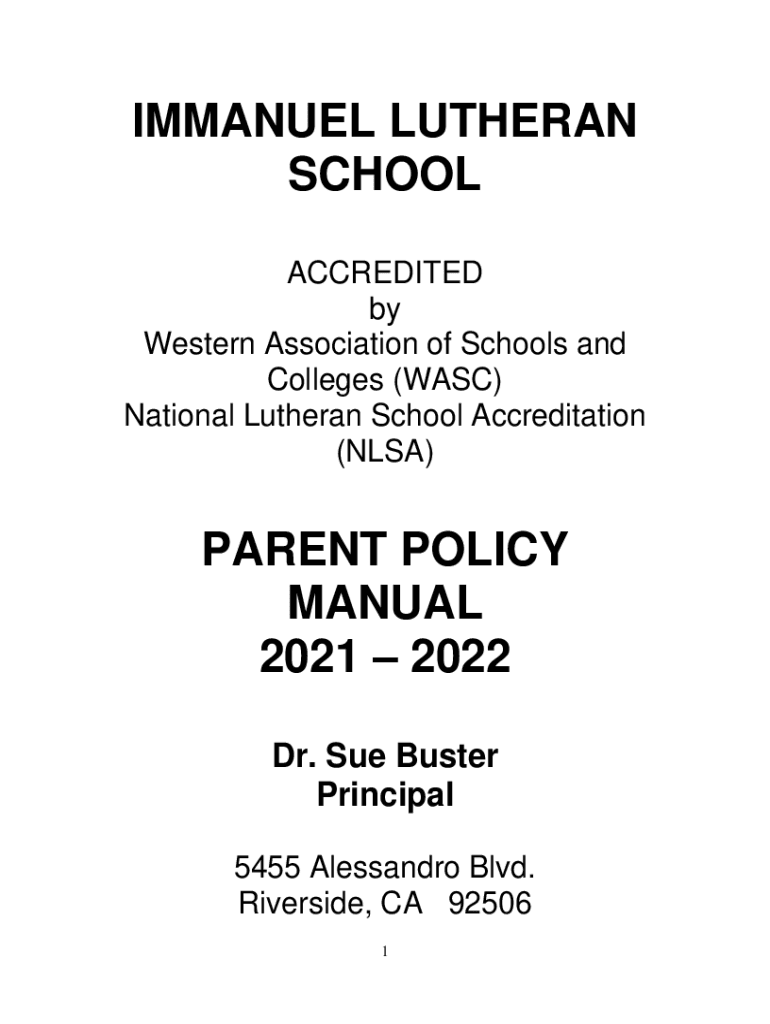 IMMANUEL LUTHERAN SCHOOL ACCREDITED by Western Association of Schools and Colleges (WASC) National Lutheran School Accreditation (NLSA)PARENT POLICY MANUAL 2021 2022 Dr. Sue Buster Principal 5455