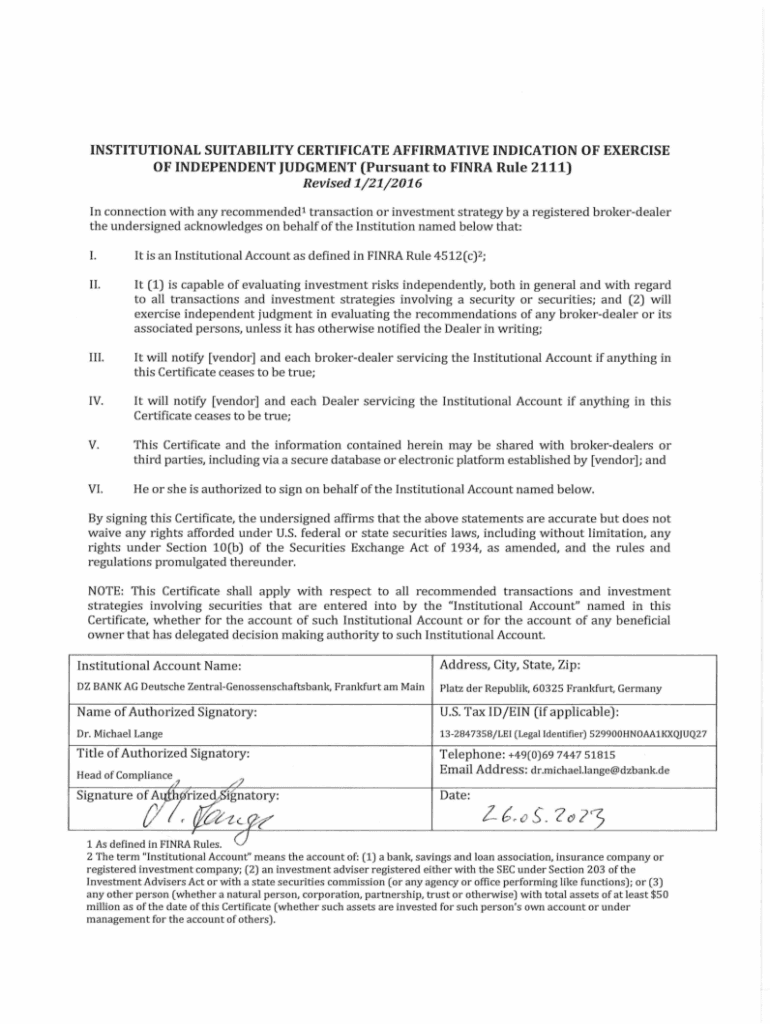 INSTITUTIONAL SUITABILITY CERTIFICATE AFFIRMATIVE INDICATION OF EXERCISE OF INDEPENDENT JUDGMENT (Pursuant to FINRA Rule 2111) Revised 1/21/2016 In connection with any recommended1 transaction or