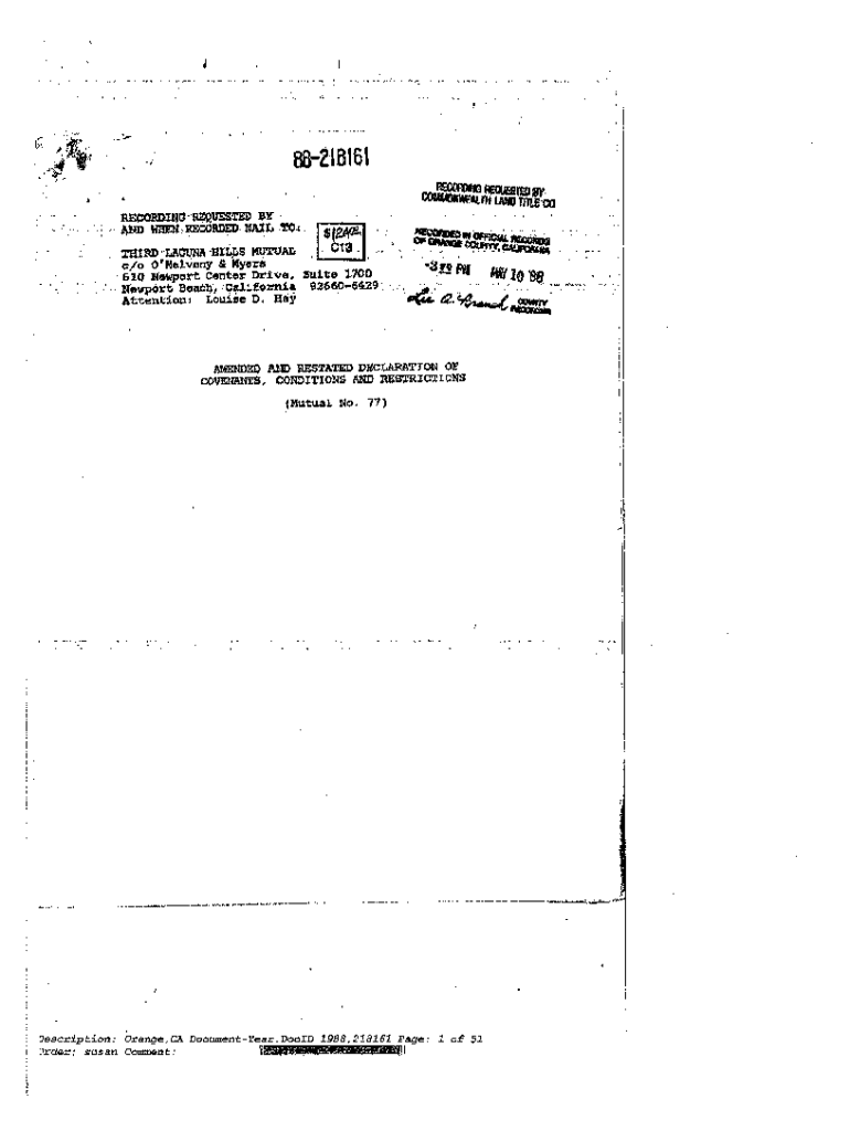 I 88218161lMENDED lND llESTA\'rED DECLAPATlON OF COVE!WlTS, CONDITIONS AND RES\'r!UCTIONS(Mutual No. 77)\'\"\'...?escription: Orange, CA DocumentYear.DocID 1988.218161 Page: 1 of 51 \')rder: susan