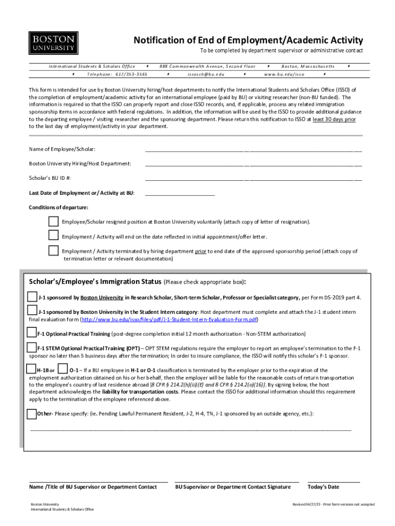 Notification of End of Employment/Academic Activity To be completed by department supervisor or administrative contactInternational Students & Scholars OfficeTe l e p h o n e : 6 1 7 / 3 5 3 3 5 6