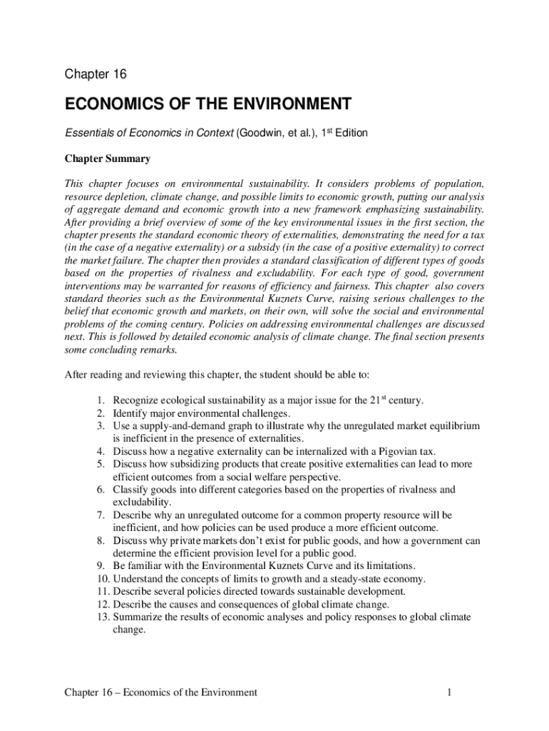 Chapter 16ECONOMICS OF THE ENVIRONMENT Essentials of Economics in Context (Goodwin, et al.), 1st Edition Chapter Summary This chapter focuses on environmental sustainability. It considers problems