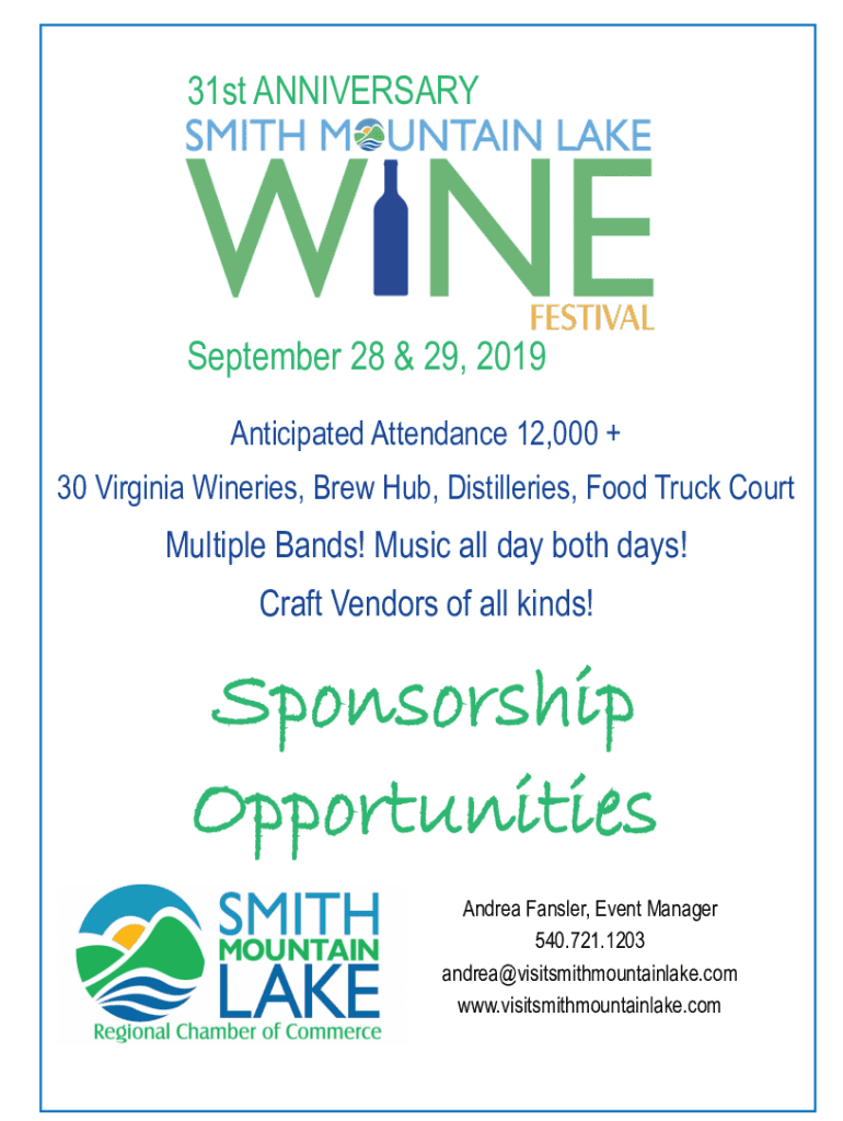 31st ANNIVERSARYSeptember 28 & 29, 2019 Anticipated Attendance 12,000 +30 Virginia Wineries, Brew Hub, Distilleries, Food Truck CourtMultiple Bands! Music all day both days! Craft Vendors of all kinds!Sponsorship