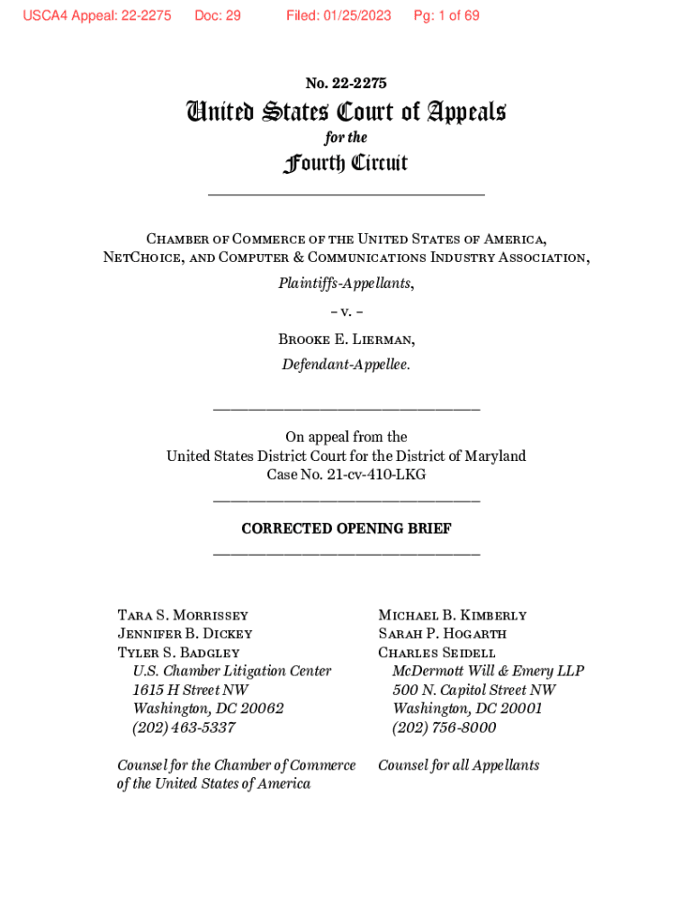 USCA4 Appeal: 222275Doc: 29Filed: 01/25/2023Pg: 1 of 69No. 222275United States Court of Appeals for theFourth Circuit ___ Chamber of Commerce of the United States of America, NetChoice, and Computer