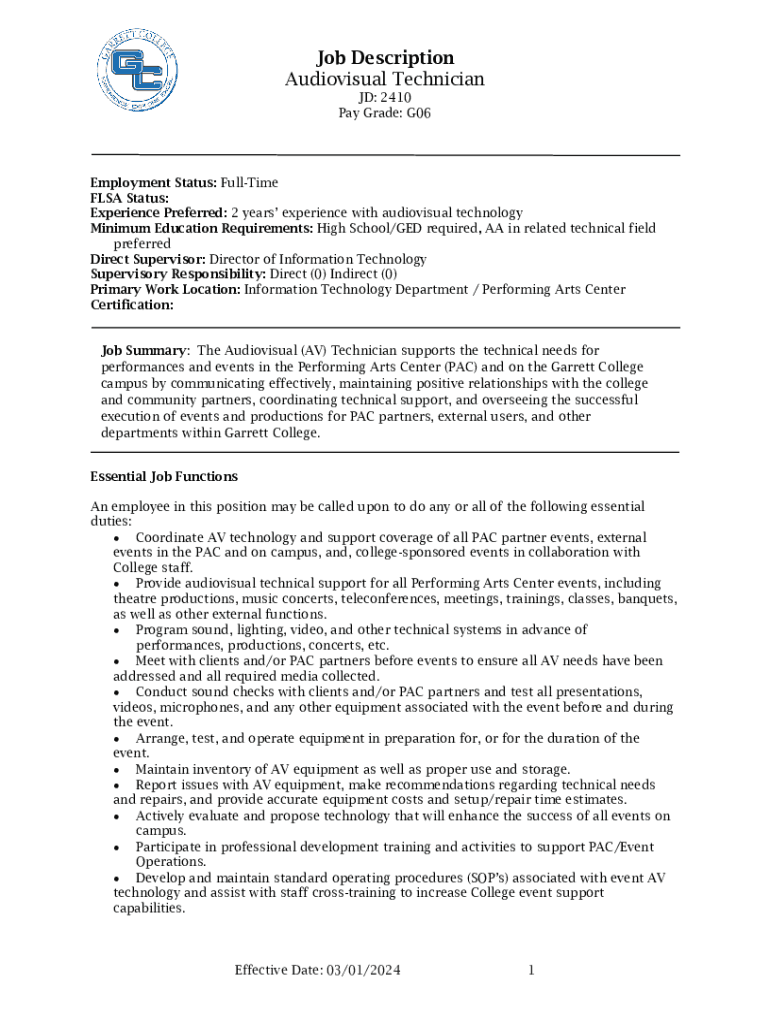 Job Description Audiovisual Technician JD: 2410 Pay Grade: G06Employment Status: FullTime FLSA Status: Experience Preferred: 2 years experience with audiovisual technology Minimum Education Requirements:
