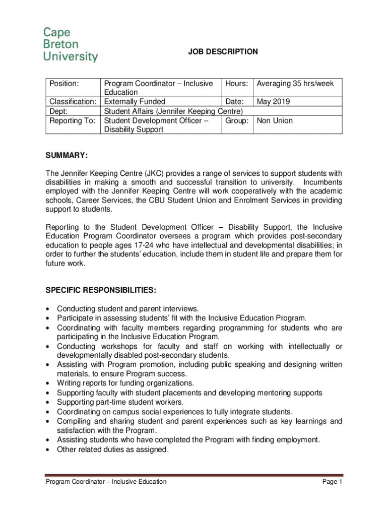JOB DESCRIPTIONPosition: Classification: Dept: Reporting To:Program Coordinator Inclusive Hours: Education Externally Funded Date: Student Affairs (Jennifer Keeping Centre) Student Development Officer