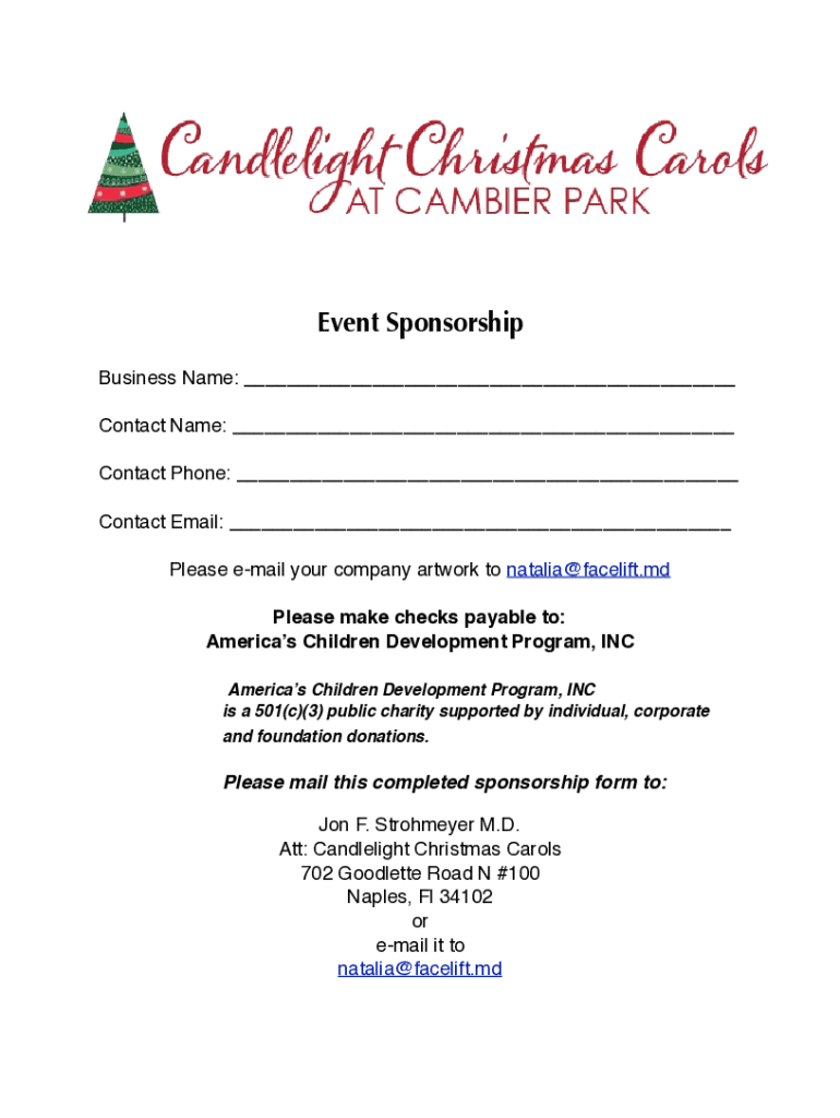 Event Sponsorship Business Name: ___ Contact Name: ___ Contact Phone: ___ Contact Email: ___ Please email your company artwork to natalia@facelift.md Please make checks payable to: Americas Children