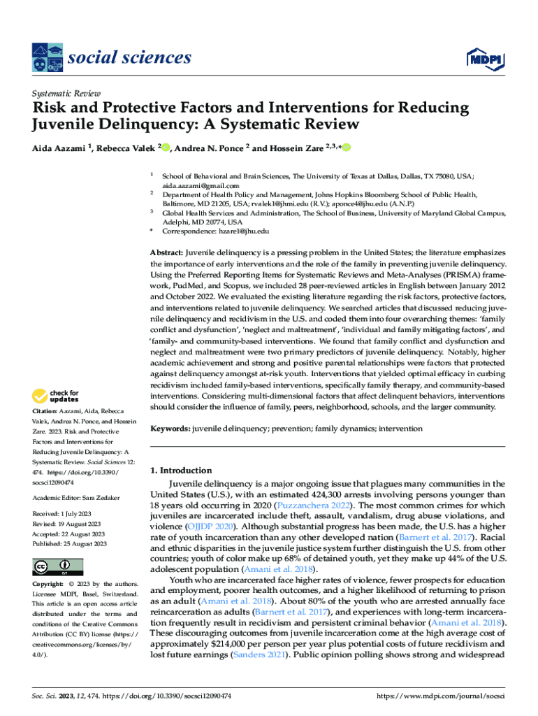 $ social sciencesSystematic ReviewRisk and Protective Factors and Interventions for Reducing Juvenile Delinquency: A Systematic Review Aida Aazami 1 , Rebecca Valek 2 , Andrea N. Ponce 2 and Hossein