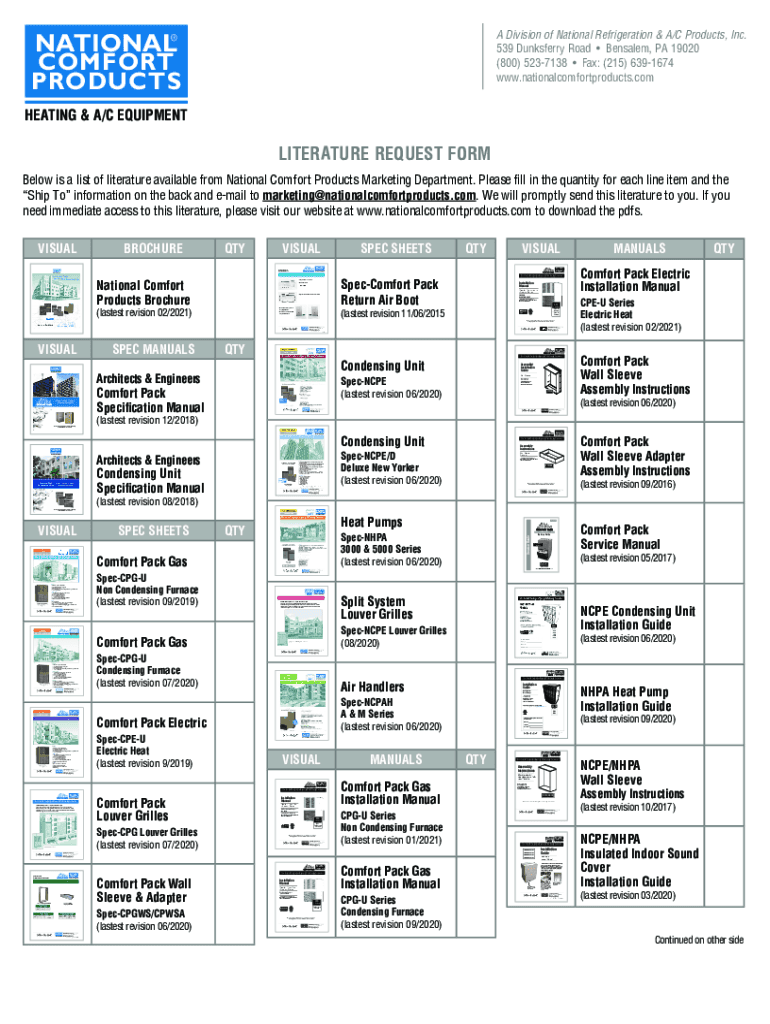 A Division of National Refrigeration & A/C Products, Inc. 539 Dunksferry Road Bensalem, PA 19020 (800) 5237138 Fax: (215) 6391674 www.nationalcomfortproducts.comNATIONAL COMFORT PRODUCTS HEATING &