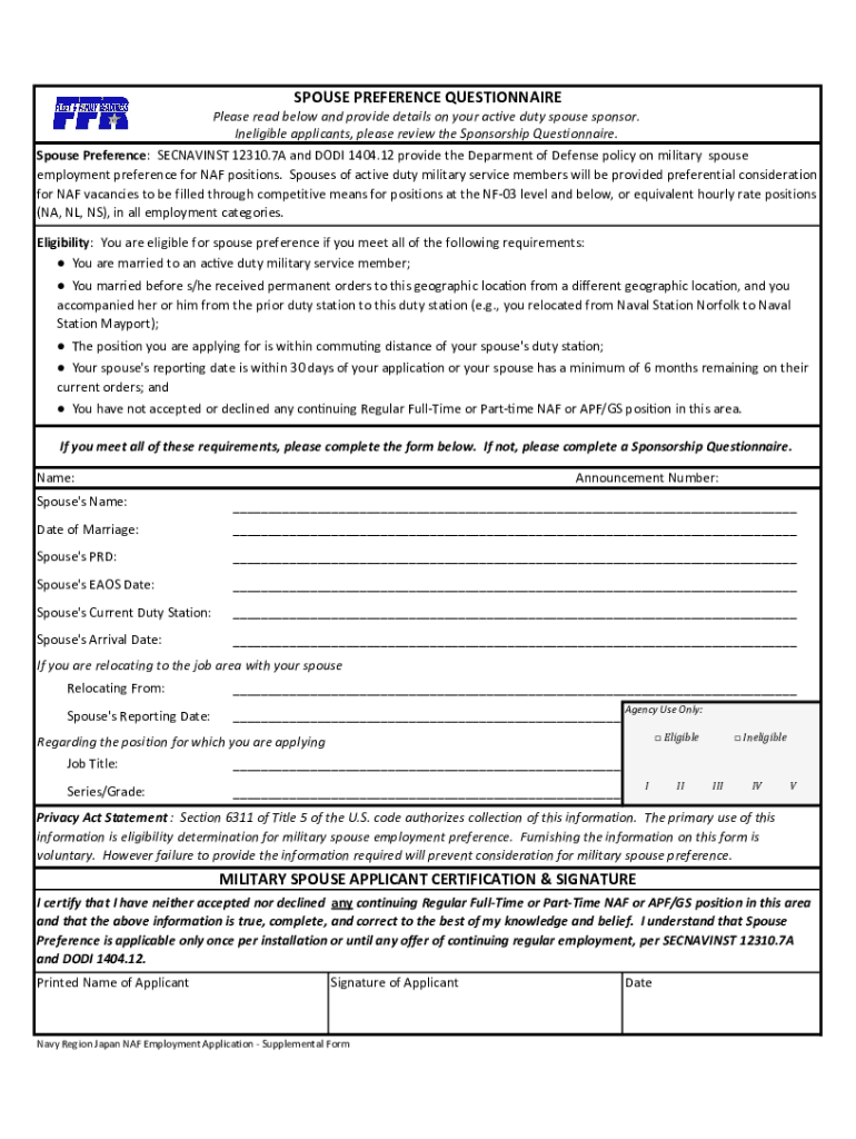 SPOUSEPREFERENCEQUESTIONNAIRE Pleasereadbelowandprovidedetailsonyouractivedutyspousesponsor. Ineligibleapplicants,pleasereviewtheSponsorshipQuestionnaire. SpousePreference:SECNAVINST12310.7AandDODI1404.12providetheDeparmentofDefensepolicyonmilitaryspouse