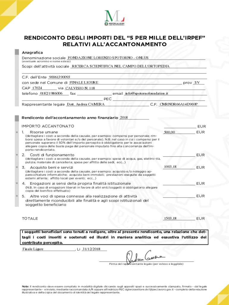 RENDICONTO DEGLI IMPORTI DEL 5 PER MILLE DELLIRPEFDenominazione sociale ___ (eventuale acronimo e nome esteso)___telefono ___ fax ___ email ______(dettagliare i costi a seconda della causale, per