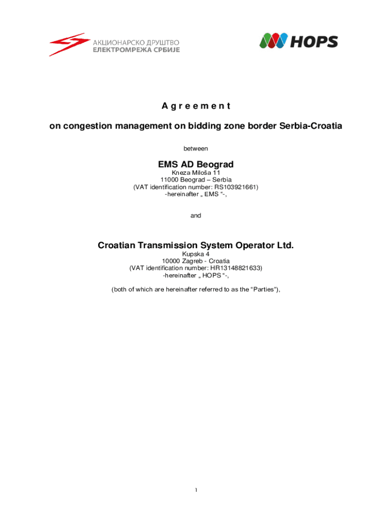 Agreement on congestion management on bidding zone border SerbiaCroatia betweenEMS AD Beograd Kneza Miloa 11 11000 Beograd Serbia (VAT identification number: RS103921661) hereinafter EMS ,andCroatian