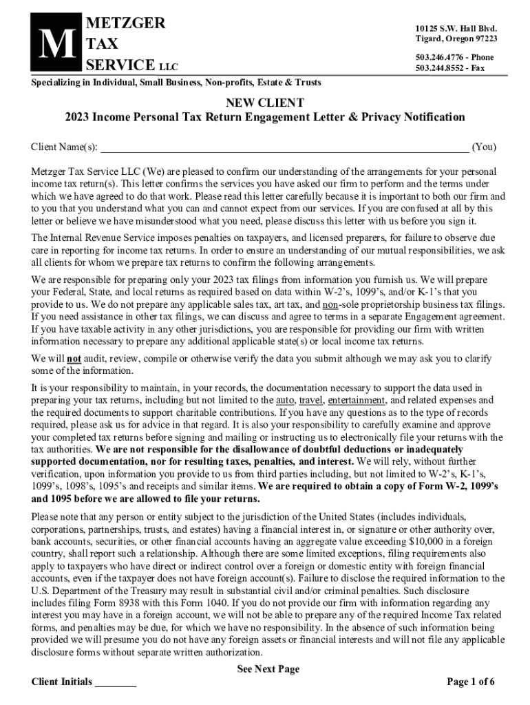 MMETZGER TAX SERVICE LLC10125 S.W. Hall Blvd. Tigard, Oregon 97223 503.246.4776 Phone 503.244.8552 FaxSpecializing in Individual, Small Business, Nonprofits, Estate & TrustsNEW CLIENT 2023 Income
