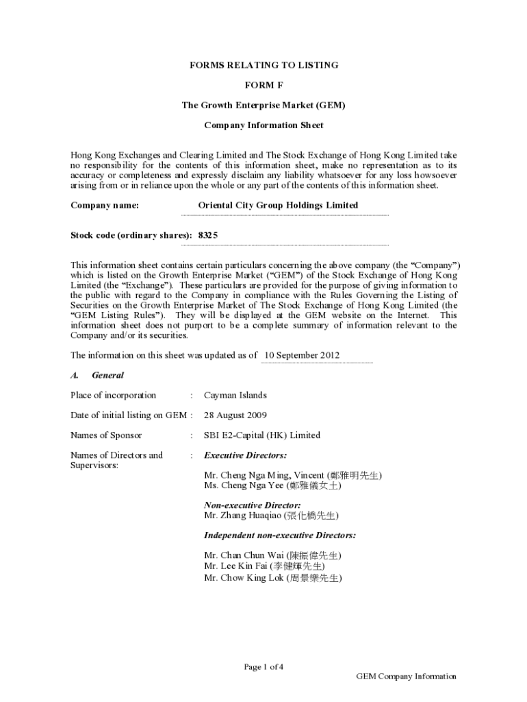 FORMS RELATING TO LISTING FORM F The Growth Enterprise Market (GEM) Company Information Sheet Hong Kong Exchanges and Clearing Limited and The Stock Exchange of Hong Kong Limited take no responsibility