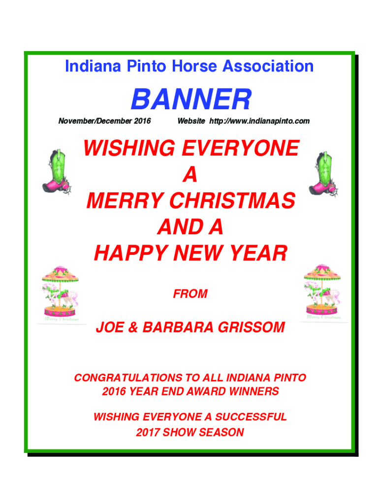Indiana Pinto Horse AssociationBANNER November/December 2016Website http://www.indianapinto.comWISHING EVERYONE A MERRY CHRISTMAS AND A HAPPY NEW YEAR FROMJOE & BARBARA GRISSOMCONGRATULATIONS TO ALL