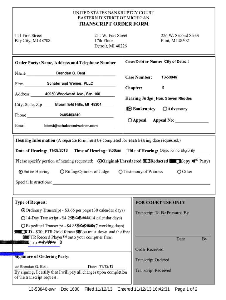 UNITED STATES BANKRUPTCY COURT EASTERN DISTRICT OF MICHIGANTRANSCRIPT ORDER FORM111 First Street Bay City, MI 48708211 W. Fort Street 17th Floor Detroit, MI 48226226 W. Second Street Flint, MI 48502Case/Debtor