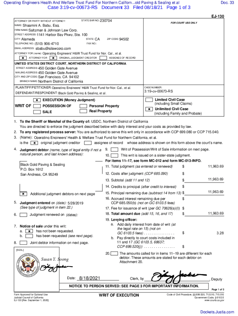 Operating Engineers Health And Welfare Trust Fund For Northern Californ...old Paving & Sealing et alDoc. 33Case 3:19cv00673RS Document 33 Filed 08/18/21 Page 1 of 3 EJ130 STATE BAR NO.: 230704ATTORNEY