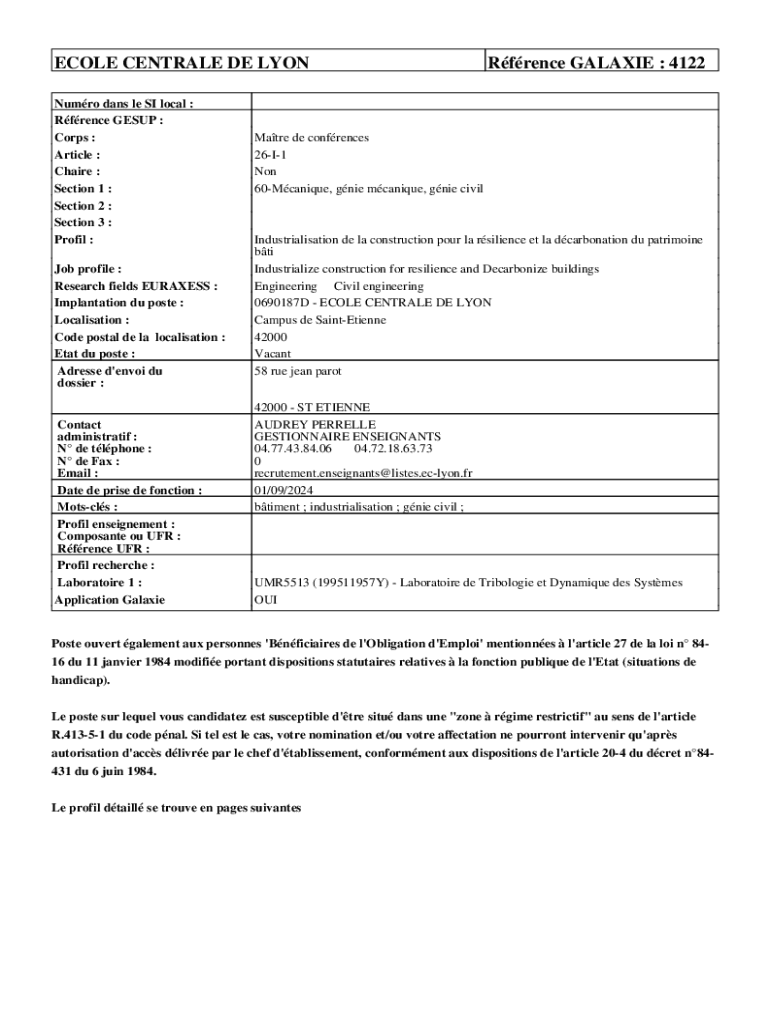 ECOLE CENTRALE DE LYON Numro dans le SI local : Rfrence GESUP : Corps : Article : Chaire : Section 1 : Section 2 : Section 3 : Profil : Job profile : Research fields EURAXESS : Implantation du poste
