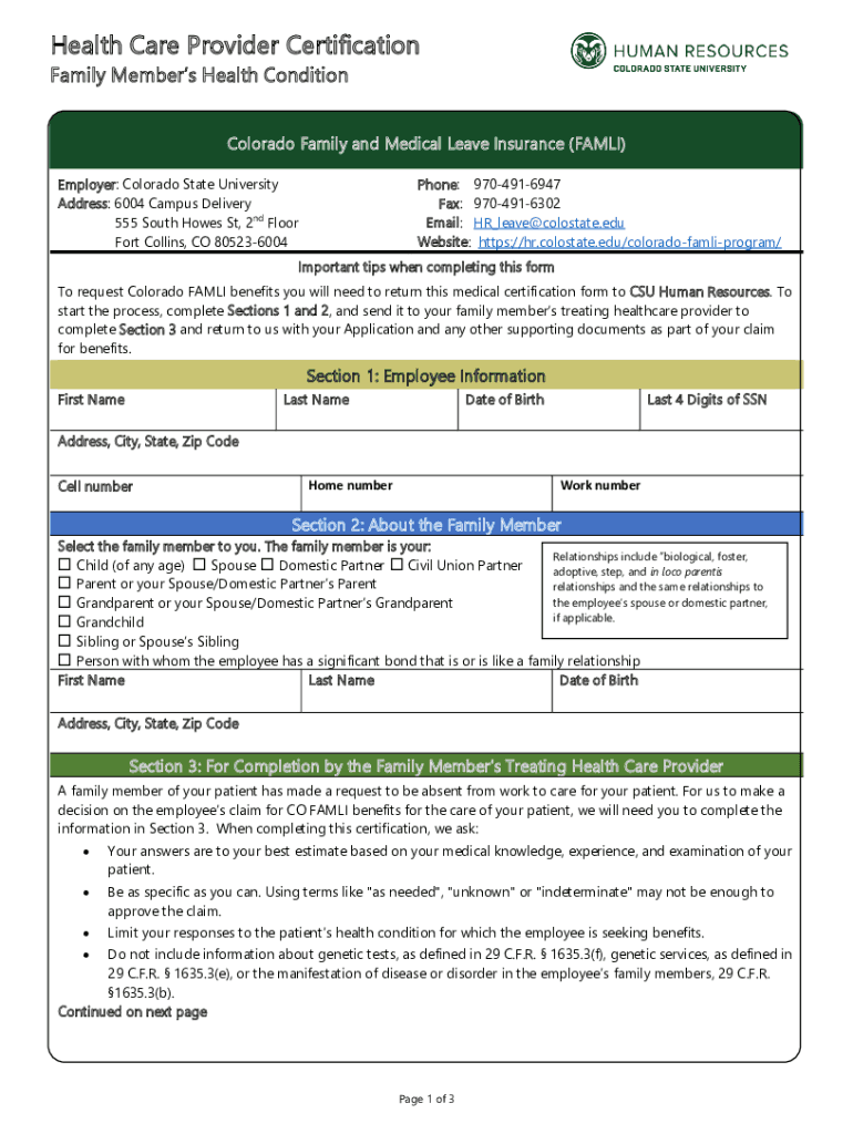 Health Care Provider Certification Family Members Health Condition Colorado Family and Medical Leave Insurance (FAMLI) Employer: Colorado State University Address: 6004 Campus Delivery 555 South Howes