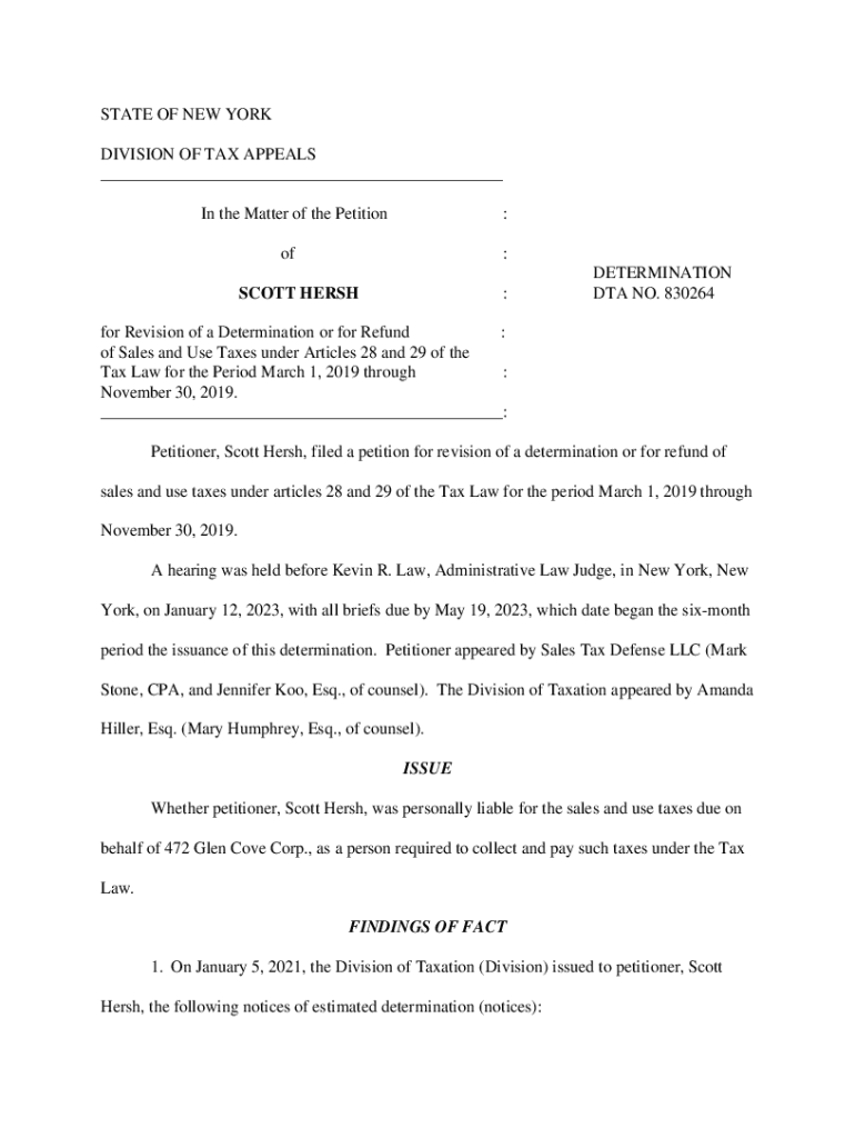STATE OF NEW YORK DIVISION OF TAX APPEALS ___ In the Matter of the Petition:of:SCOTT HERSH:DETERMINATION DTA NO. 830264for Revision of a Determination or for Refund : of Sales and Use Taxes under