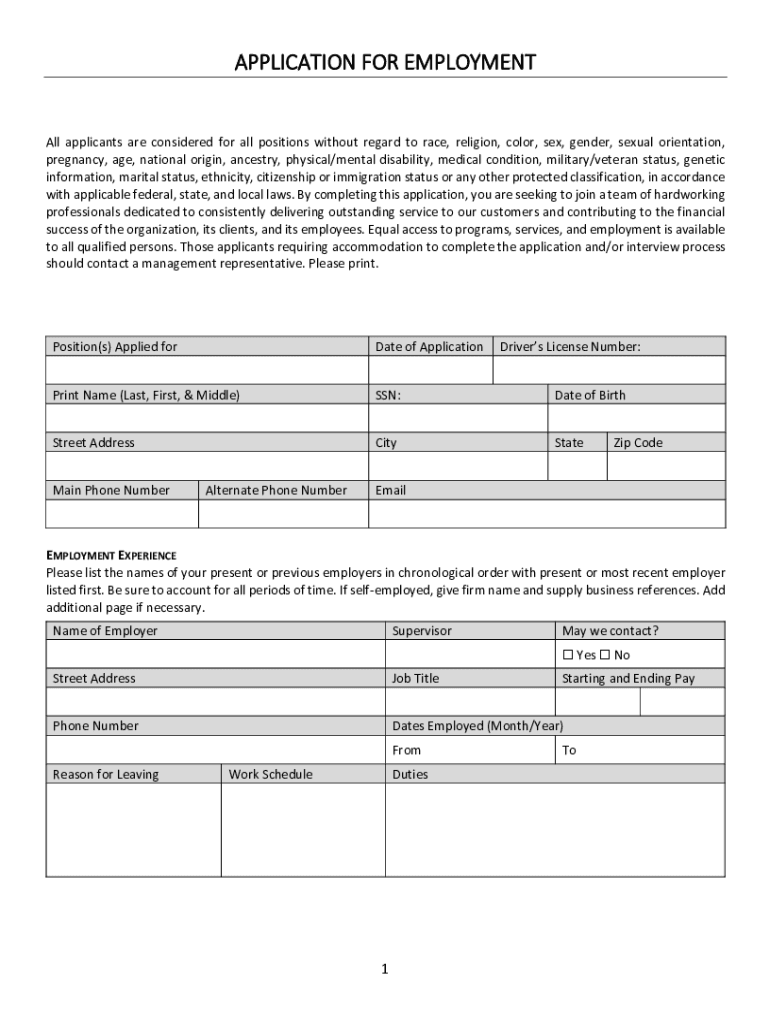 APPLICATION FOR EMPLOYMENTAll applicants are considered for all positions without regard to race, religion, color, sex, gender, sexual orientation, pregnancy, age, national origin, ancestry, physical/mental