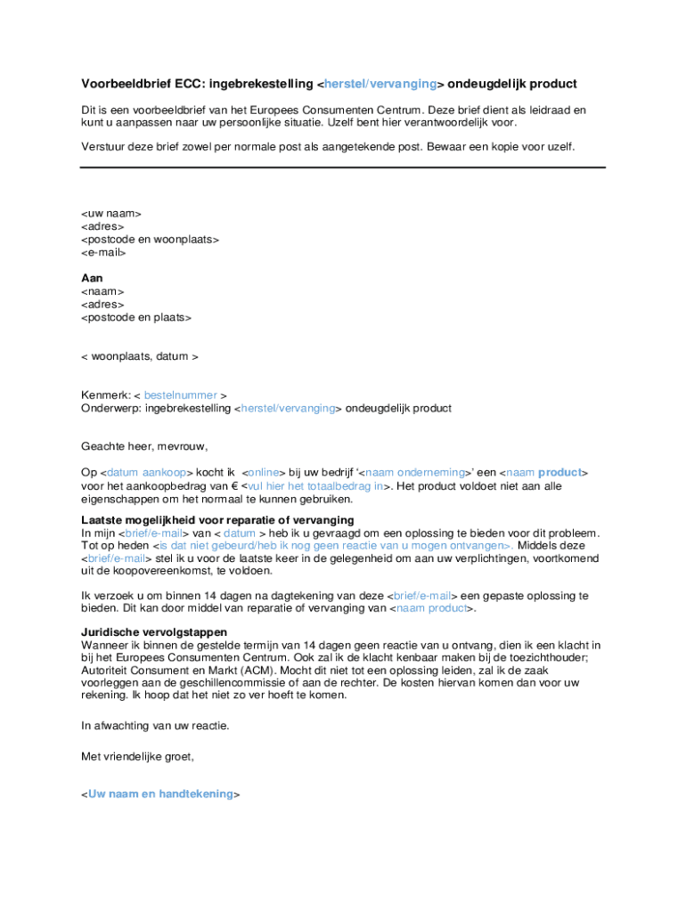 Voorbeeldbrief ECC: ingebrekestelling herstel/vervanging ondeugdelijk product Dit is een voorbeeldbrief van het Europees Consumenten Centrum. Deze brief dient als leidraad en kunt u aanpassen naar