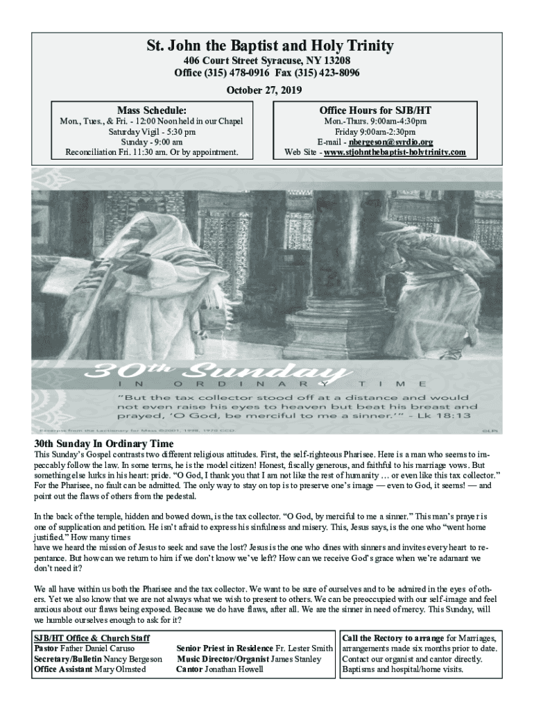 St. John the Baptist and Holy Trinity 406 Court Street Syracuse, NY 13208 Office (315) 4780916 Fax (315) 4238096 October 27, 2019 Mass Schedule:Office Hours for SJB/HTMon., Tues., & Fri. 12:00 Noon
