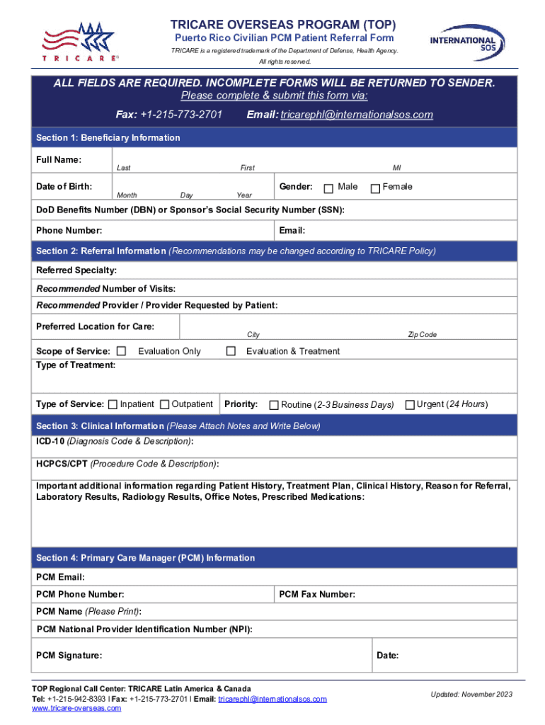 TRICARE OVERSEAS PROGRAM (TOP) Puerto Rico Civilian PCM Patient Referral FormTRICARE is a registered trademark of the Department of Defense, Health Agency. All rights reserved.ALL FIELDS ARE REQUIRED.