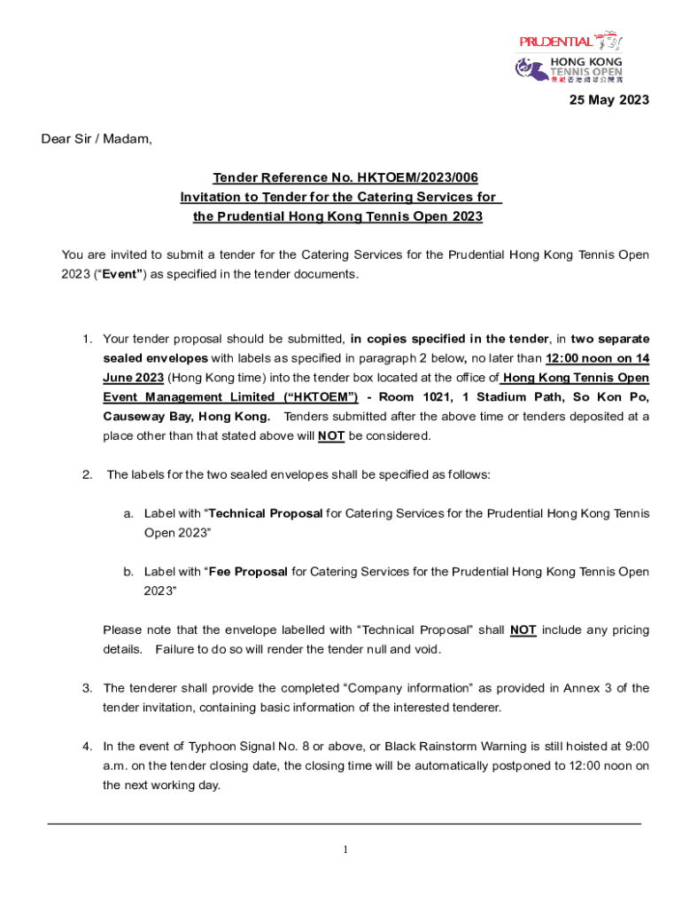 25 May 2023 Dear Sir / Madam, Tender Reference No. HKTOEM/2023/006 Invitation to Tender for the Catering Services for the Prudential Hong Kong Tennis Open 2023 You are invited to submit a tender for