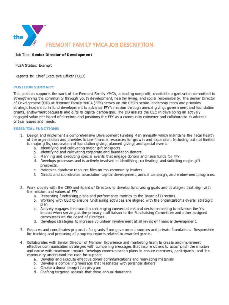 FREMONT FAMILY YMCA JOB DESCRIPTION Job Title: Senior Director of Development FLSA Status: Exempt Reports to: Chief Executive Officer (CEO) POSITION SUMMARY: This position supports the work of the