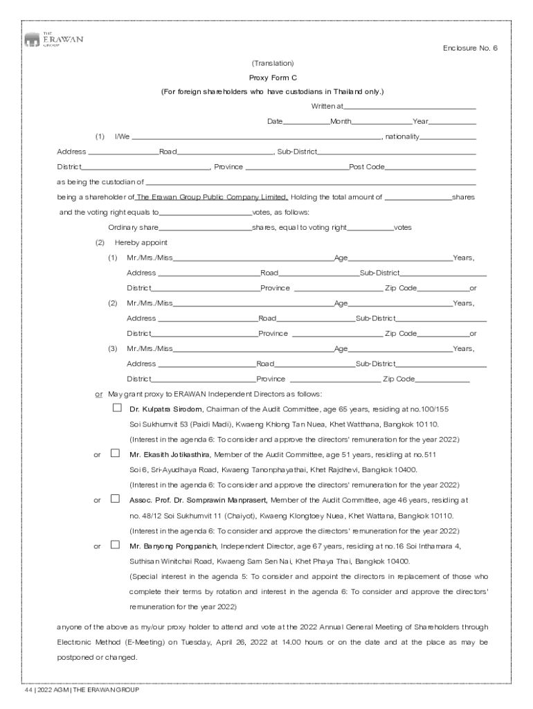 Enclosure No. 6(1) I/We(Translation) Proxy Form C (For foreign shareholders who have custodians in Thailand only.) Written at Date Month Year , nationality Road , SubDistrict , Province Post CodeAddress