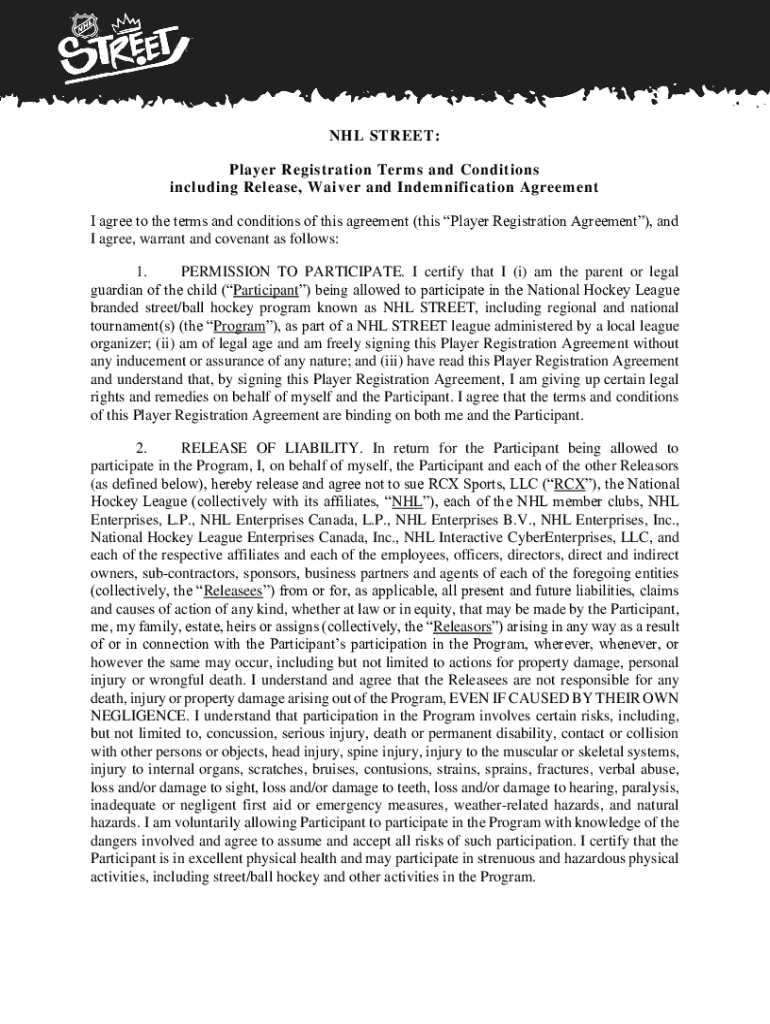 NHL STREET: Player Registration Terms and Conditions including Release, Waiver and Indemnification Agreement I agree to the terms and conditions of this agreement (this Player Registration Agreement),