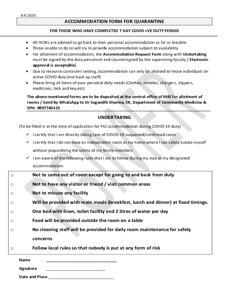 8.4.2020ACCOMMODATION FORM FOR QUARANTINE FOR THOSE WHO HAVE COMPLETED 7 DAY COVID +VE DUTY PERIOD All HCWs are advised to go back to their personal accommodation as far as feasible Those unable to