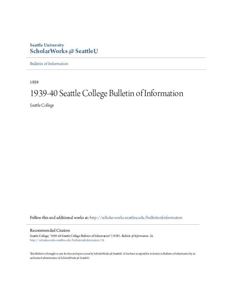 Seattle UniversityScholarWorks @ SeattleU Bulletin of Information1939193940 Seattle College Bulletin of Information Seattle CollegeFollow this and additional works at: http://scholarworks.seattleu.edu/bulletinofinformation