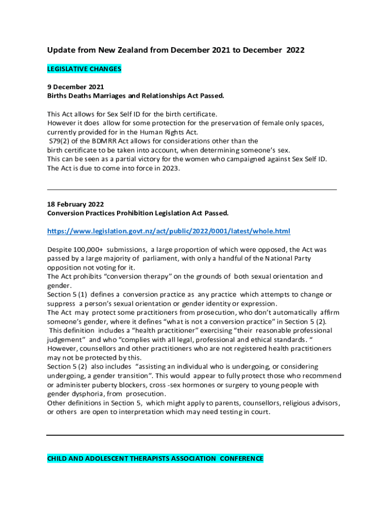 Update from New Zealand from December 2021 to December 2022 LEGISLATIVE CHANGES 9 December 2021 Births Deaths Marriages and Relationships Act Passed. This Act allows for Sex Self ID for the birth