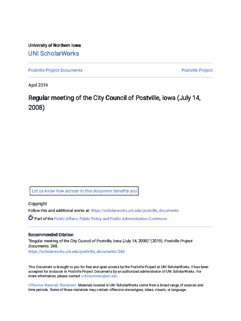 University of Northern IowaUNI ScholarWorks Postville Project DocumentsPostville ProjectApril 2019Regular meeting of the City Council of Postville, Iowa (July 14, 2008)Let us know how access to this