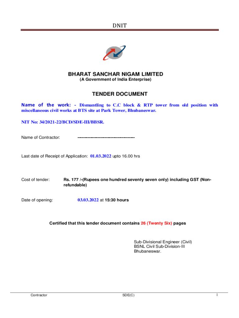 DNITBHARAT SANCHAR NIGAM LIMITED (A Government of India Enterprise)TENDER DOCUMENT Name of the work: Dismantling to C.C block & RTP tower from old position with miscellaneous civil works at BTS site