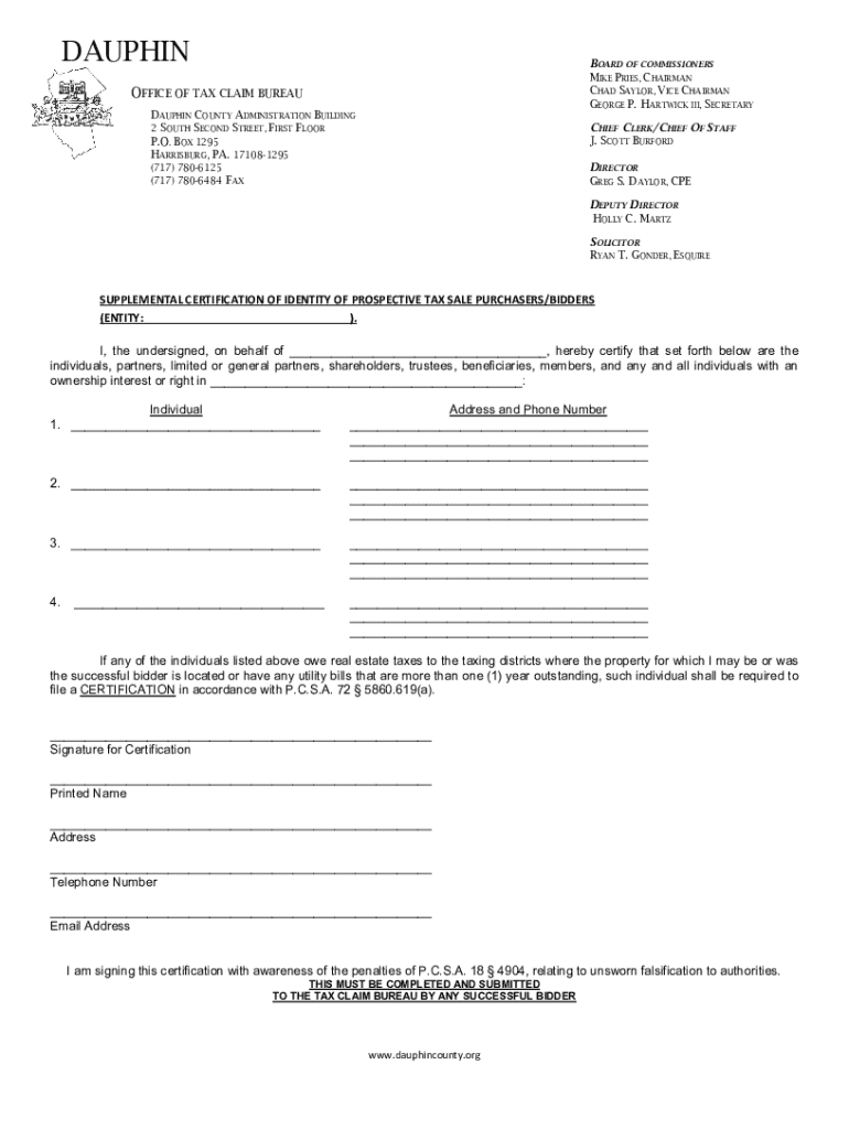 DAUPHIN OFFICE OF TAX CLAIM BUREAU COUNTYBOARD OF COMMISSIONERS MIKE PRIES, CHAIRMAN CHAD SAYLOR, VICE CHAIRMAN GEORGE P. HARTWICK III, SECRETARYDAUPHIN COUNTY ADMINISTRATION BUILDING 2 SOUTH SECOND